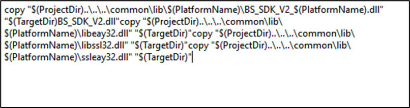 When using the BioStar 2 Device SDK sample code, the DLL files are copied through the Pre-Build event in the Visual Studio build settings.