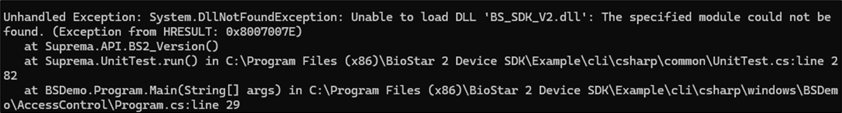 After upgrading the BioStar 2 Device SDK from an earlier version to v2.6.0 or later, the application may throw a System.DllNotFoundException in C# using the BioStar 2 Device SDK.