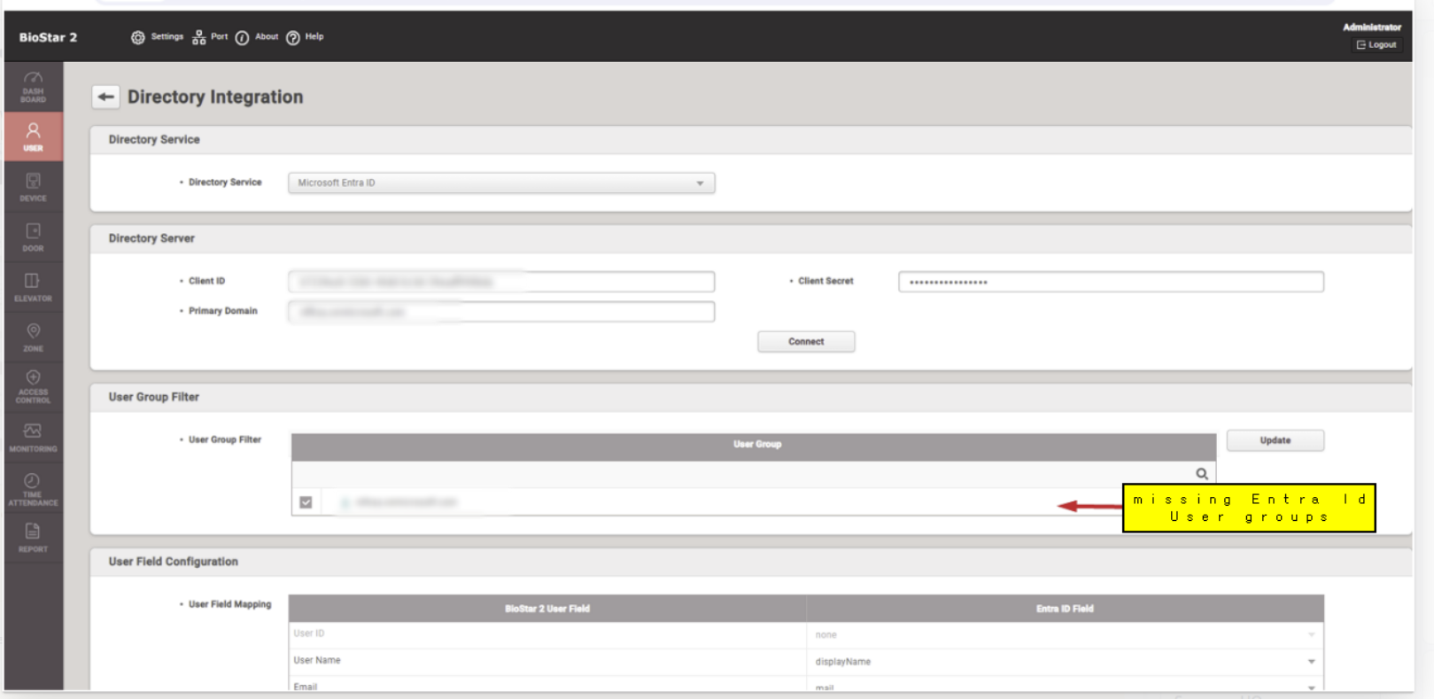 When BioStar is connected to Entra ID, the system will fail to display User Groups inside the BioStar Directory Integration Settings page.