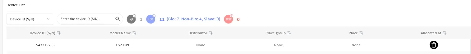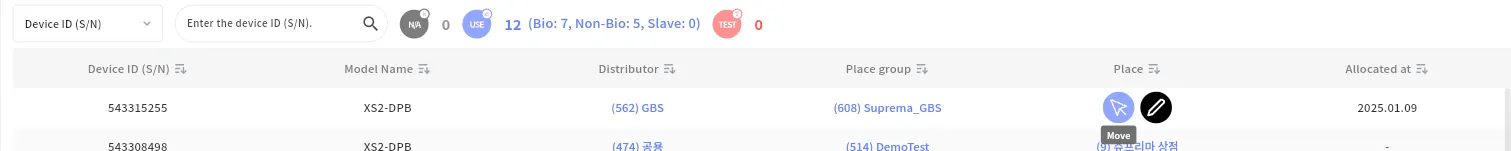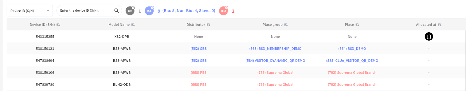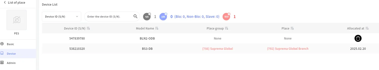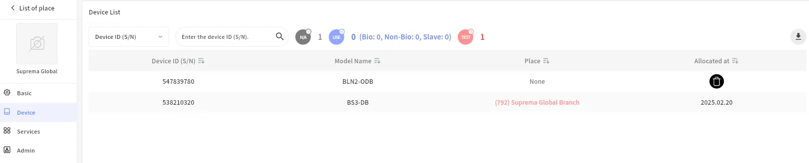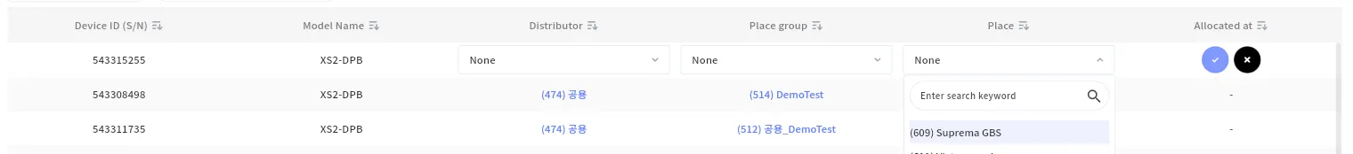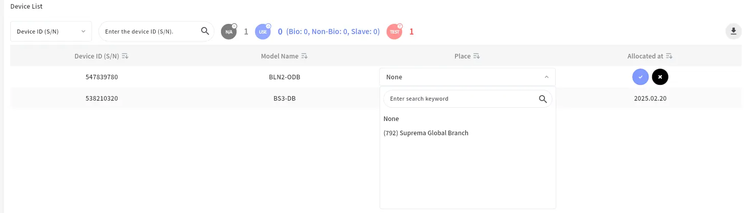 From the disti level, branch admins can allocate devices assigned to them to sub-place groups or individual places. If the device you need to register is not visible in the list, please contact the relevant Suprema branch or headquarters.