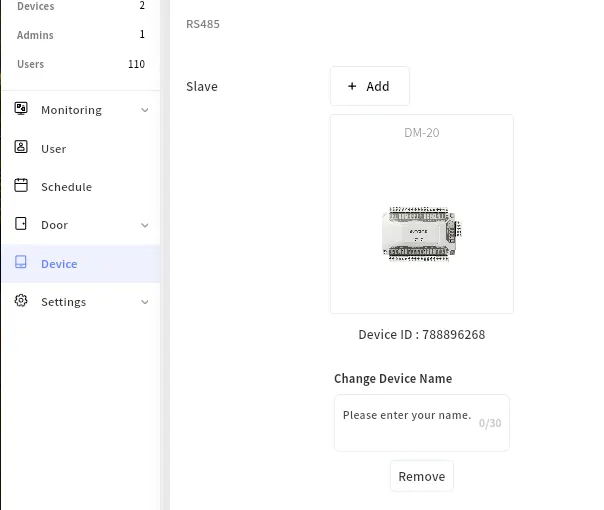 When using an RS485 slave device such as SIO2 and DM-20, it must be assigned to a place like a regular device. Additionally, the slave device must be added to the master device.