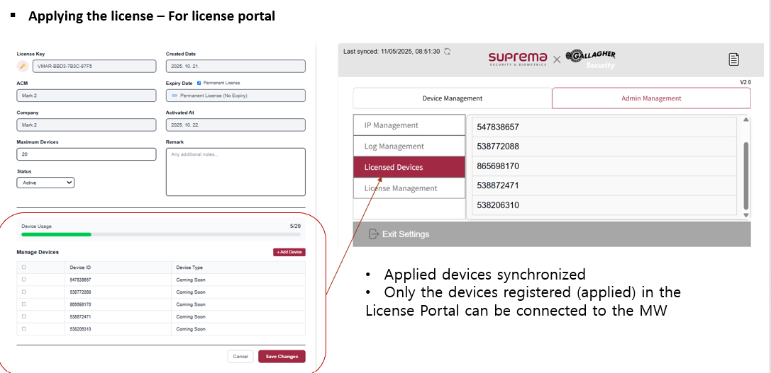 The essential requirement for the Suprema device license is that the Device ID of each unit must be registered within the license server system.