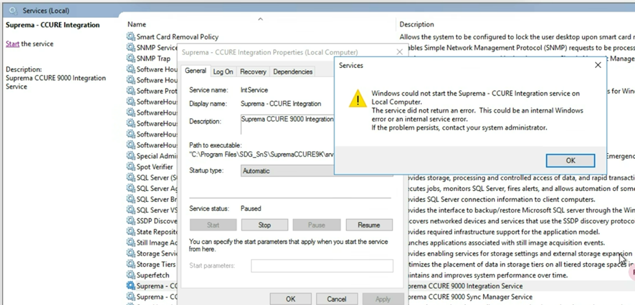 When in the Windows Services console, the "Suprema - CCURE Integration service" shows as Paused, or when trying to start it shows the following error: