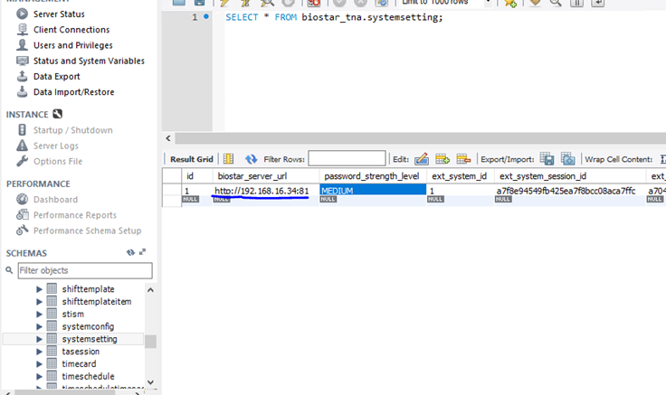 > 5. Ve a la base de datos TA de BioStar2 y luego edita los datos de biostar_server_url en la configuración del sistema como la dirección IP interna del servidor Biostar2