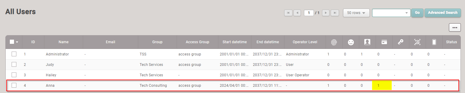 También puede comprobar en la interfaz de usuario web de BioStar 2 que el usuario con el ID de usuario "4" ahora tiene una credencial de tarjeta de tipo wiegand.