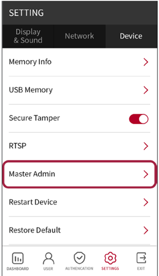 設定(Setting) → 端末(Device) → マスター管理者(Master Admin)