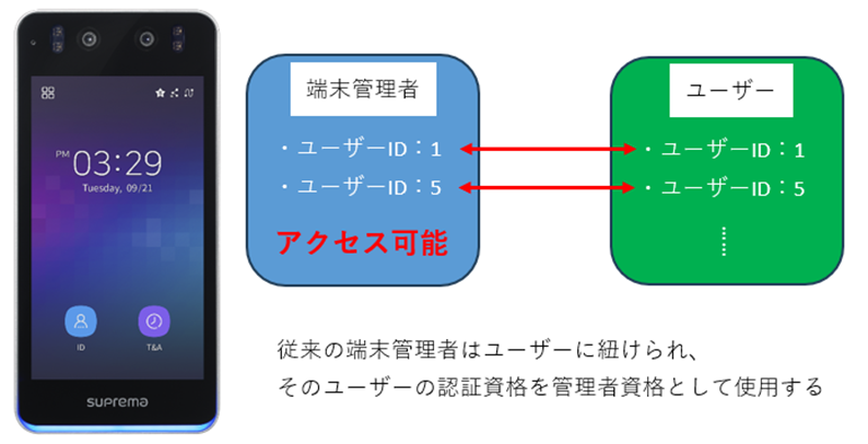 つまり、従来の端末管理者は「顔のみ」や「カードのみ」の認証で端末の設定画面にアクセスできていましたが、今後マスター管理者とは別に端末管理者を設定する場合、そのユーザーに対して認証資格を 2要素以上を登録しておくことが必須になりました。